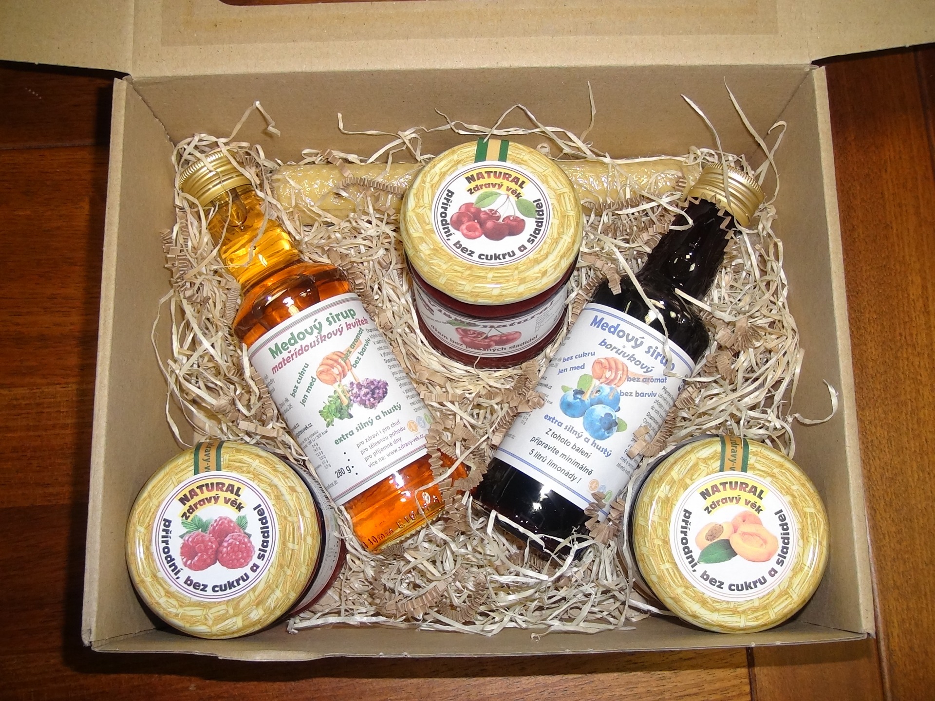 Dárkové balíčky spojují oblíbené produkty do jednoho voňavého a chutného překvapení. Balení může obsahovat maximálně: 2× med 250 g, 2× džem 210 g nebo 220 g, 1× medovinu 200 ml, 1× sirup 280 g a 1× svíčku 36 g. Jde o pečlivě sladěnou kombinaci, která potěší milovníky kvalitních dobrot z naší včelařské farmy.